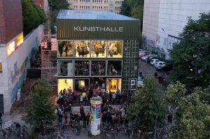 Qui di seguito il video di come è stato costruito: [Le foto sono di proprietà di kunsthalle.com]Possiamo leggere nel sito: [Platoon Kunsthalle, Berlino Schönhauser Alle, 9] – “8 camion, 2 ruspe, 40 container per costruirlo: non è un ufficio né una galleria d’arte, né un hotel. Preparatevi a entrare in un luogo di ispirazione e coraggio. Un parco di divertimenti per i cittadini.”