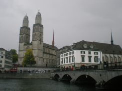 Sorta 150 anni or sono dal fossato che circondava e difendeva la città. La strada costellata di negozi e banche (ogni 300 metri) porta fino all’omonimo lago. Una pioggia torrenziale mi sorprende e cerco di ripararmi sotto le tende dei negozi. Finito di piovere riprendo il mio percorso verso il lago. Attraverso un parco molto suggestivo che lo contorna, ci sono una varietà di piante ed uccelli impressionante; lungo il tragitto incontro delle papere che apprezzano molto il mio panino al formaggio “svizzero”. Mentre offrivo inginocchiata briciole alle paperelle, una da dietro in agguato si avventa sul mio panino. Morale della favola: devo comprarne un altro. Zurigo non scarseggia di chiese, tutte più o meno uguali, la più carina esternamente è sicuramente Sankt Peter, su cui è stato costruito l’orologio più grande d’Europa. Ma il simbolo della città resta la chiesa Grossmunster.