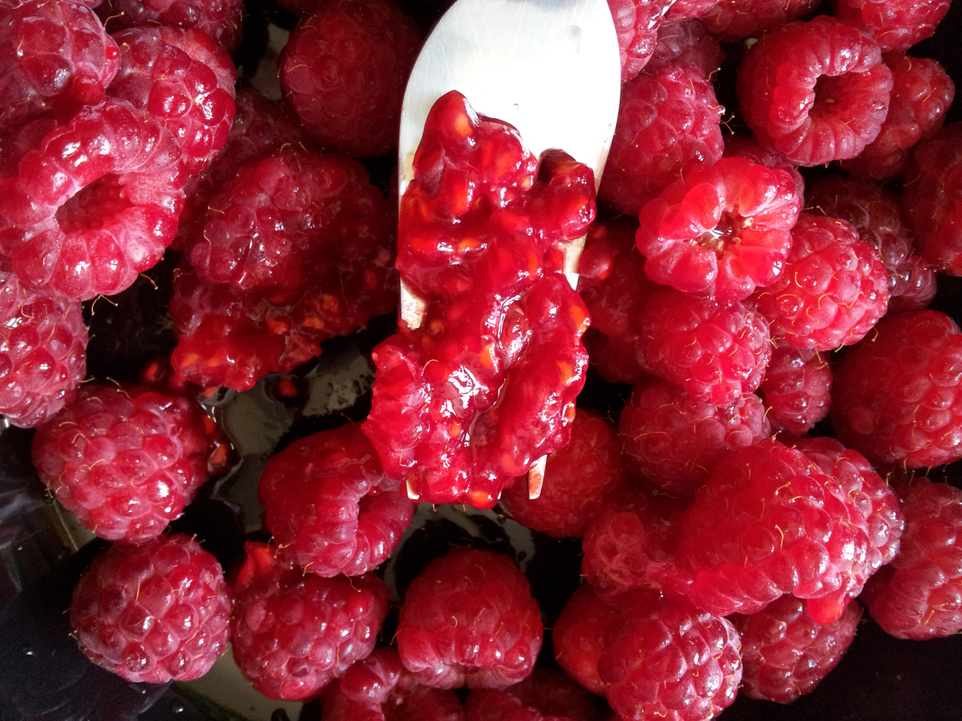 Per prima cosa schiacciare i lamponi con una forchetta.
