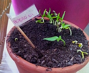 La new entry del mio orto in vaso è la piantina di peperone. Consiglio di seminare direttamente i semini che di solito gettiamo via quando cuciniamo i peperoni. Crescono rapidamente in vaso.