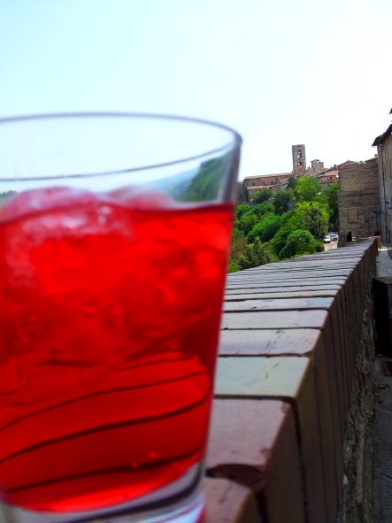 Vista la calura estiva, decidiamo di prendere un fresco aperitivo, con la speranza che le botteghe aprino (cosa che non è accaduta). Ci fermiamo ai tavolini del Bar Caffè Caterina, appena fuori le mura, perché nel borgo (oltre un ristorante che apre tardi) non c’è nulla. Dopo aver atteso un po’ senza che nessuno arrivasse, scopriamo (o per meglio dire: vado a chiedere) che non c’è servizio ai tavoli (se anche fosse segnalato non è poi tanto evidente, io non ho visto il cartello da nessuna parte, mea culpa? mha!). Il servizio è pure lento eppure oltre noi c’era solo una coppia come clienti….