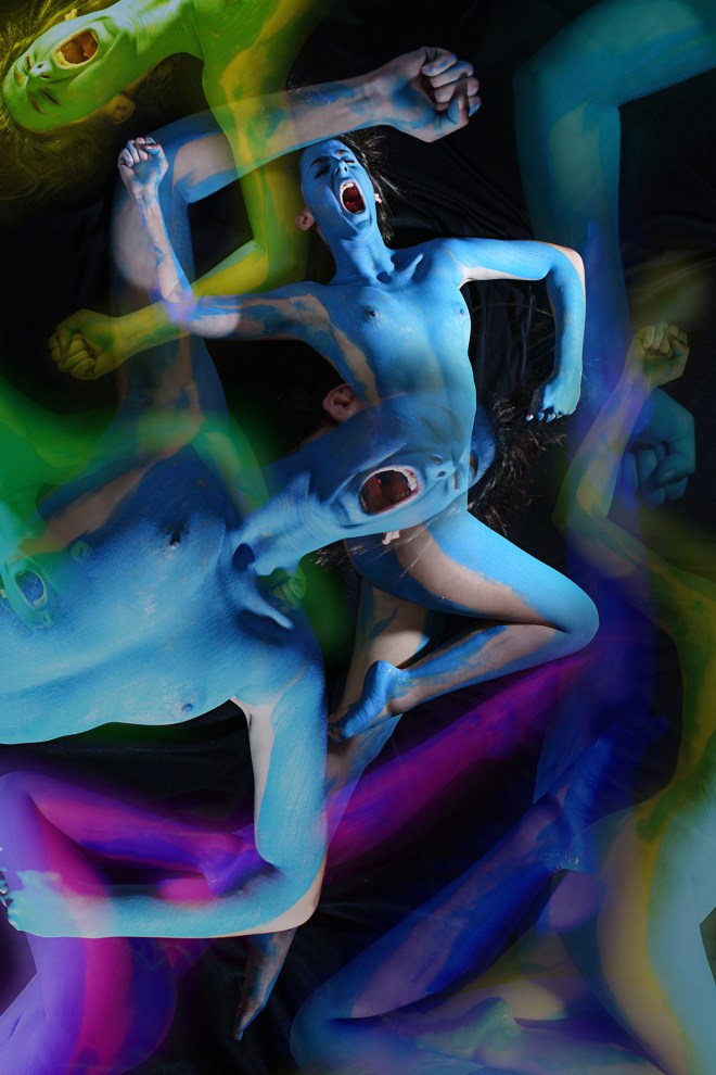 Matteo Anatrella è un fotografo napoletano, classe 1975, che fonde tecnica fotografica ad interventi grafici e manuali, al fine di ottenere immagini “dinamiche” (per sua stessa definizione), connubio tra stile e ricerca. Leggiamo nel press kit dello studio fotografico di Anatrella, che nei lavori del fotografo è decifrabile la voglia di sorprendere lo spettatore, portandolo nella sua visione/racconto. Soul and Colors_Involucri dell’Anima è una raccolta di anime al femminile, rappresentate attraverso il colore e le sensazioni che l’autore ha percepito facendo la loro conoscenza; le immagini tolgono vita al corpo nudo, che diventa semplice involucro dell’anima vitale.