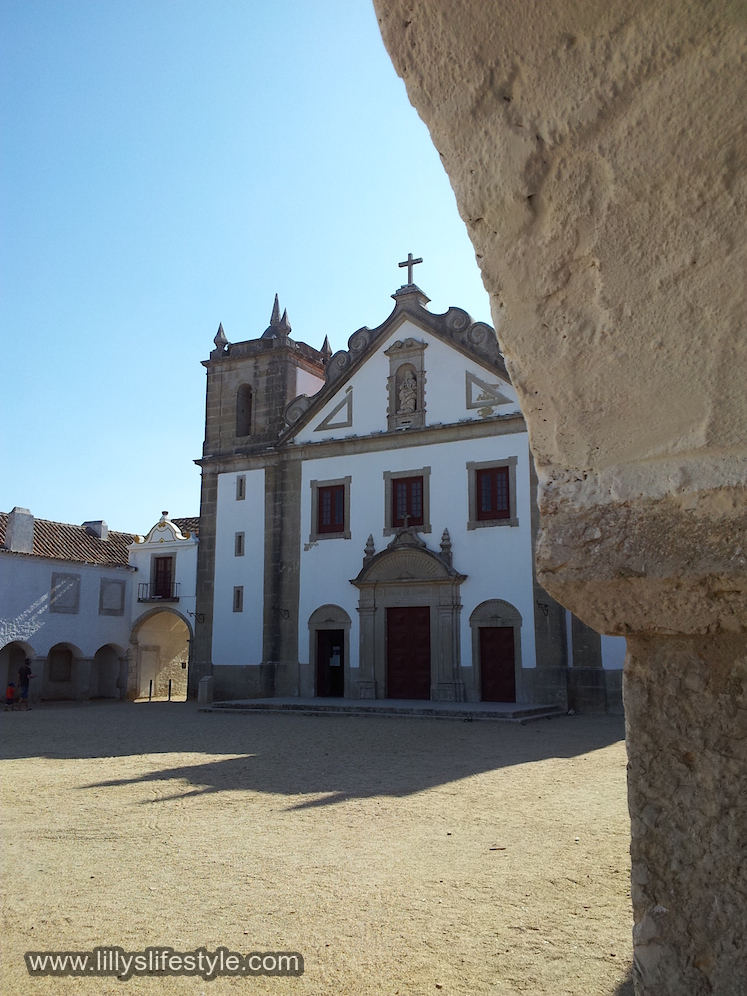 Il vento è fortissimo ma per fortuna soffia nel lato giusto, ovvero contrario alla vertiginosa e abissale Baía dos Lagosteiros. Per ammirare il faro e la baia si passa tra le lunghe braccia del Santuario di Nossa Senhora do Cabo Espichel (XIV sec.), costruito da un’eremita allo scopo di conservare un’immagine della Vergine che fu incontrata in cima ad una rocca. Le lunga braccia della chiesa centrale erano piccole case che ospitavano i pellegrini, ma nel 1715 si trasformarono in alloggi per visitatori e piccoli negozi. Oramai ve ne è solo.