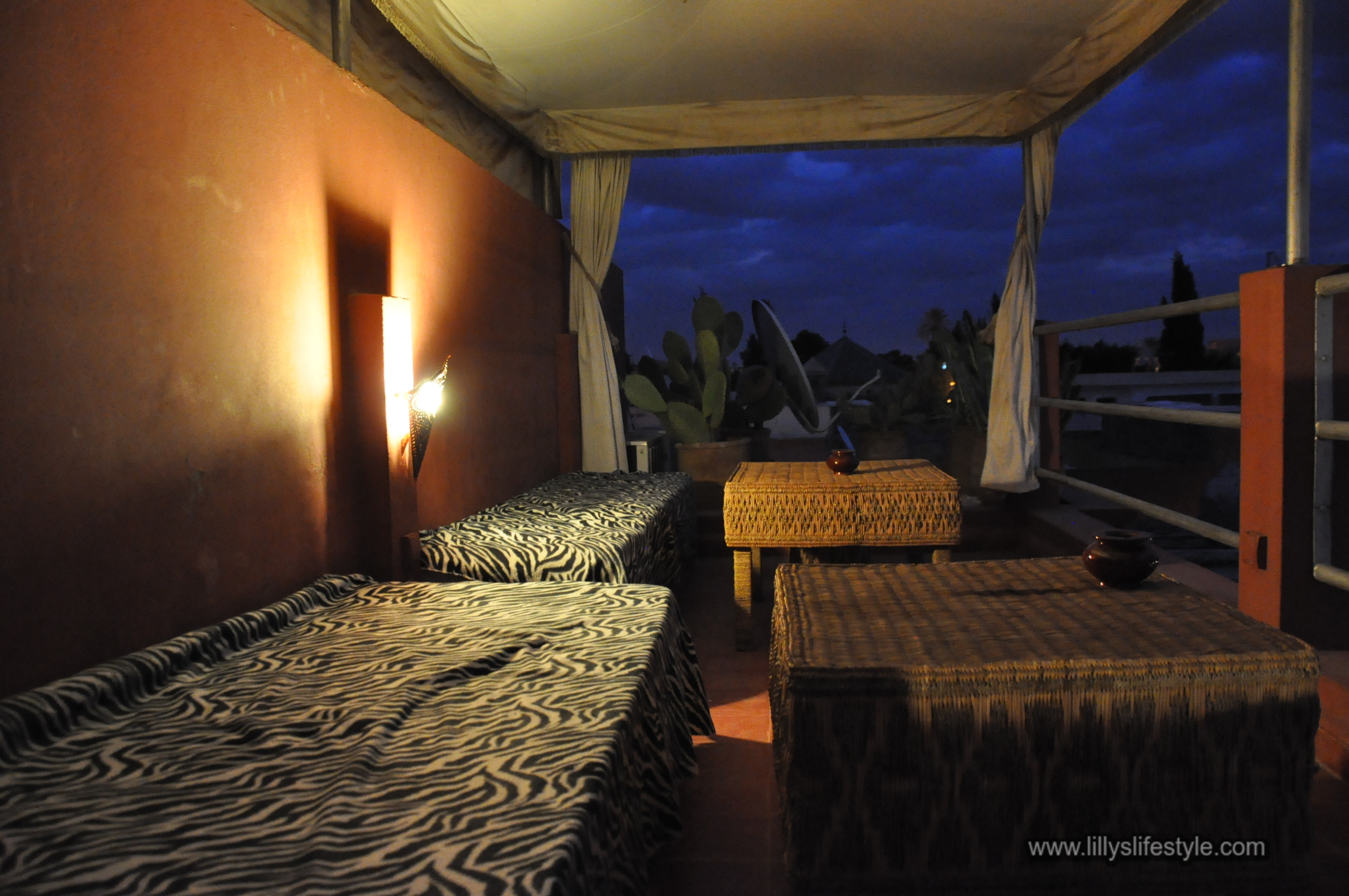 L’atmosfera è vera e familiare e sin dal primo minuto, che abbiamo varcato la soglia, una sensazione di pace e tranquillità ci ha pervasi. Sensazione quasi surreale se si pensa a Marrakech. Ci danno il benvenuto con del tè alla menta, lo gustiamo seduti ai tavolini posti nel patio proprio al lato di uno specchio d’acqua molto decorativo e rilassante. Prendiamo poi possesso della nostra stanza, che scopriamo essere la suite che sovrasta il riad, ovvero la stanza da letto del padrone che ha vissuto qui in tempi remoti. La stanza e il bagno sono enormi, nella doccia possono entrare 4 o 5 persone (peccato solo sia rotto il gancio che mantiene il braccio della doccia e quindi dobbiamo manterlo in mano). La pulizia è sopra gli standard e il silenzio regna sovrano, si sentono solo gli uccellini (e ovviamente alle 5:40 la preghiera, ma vi abituerete).