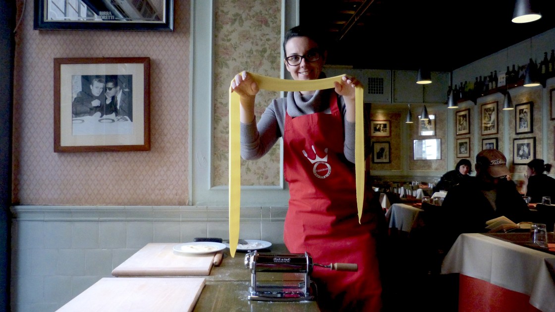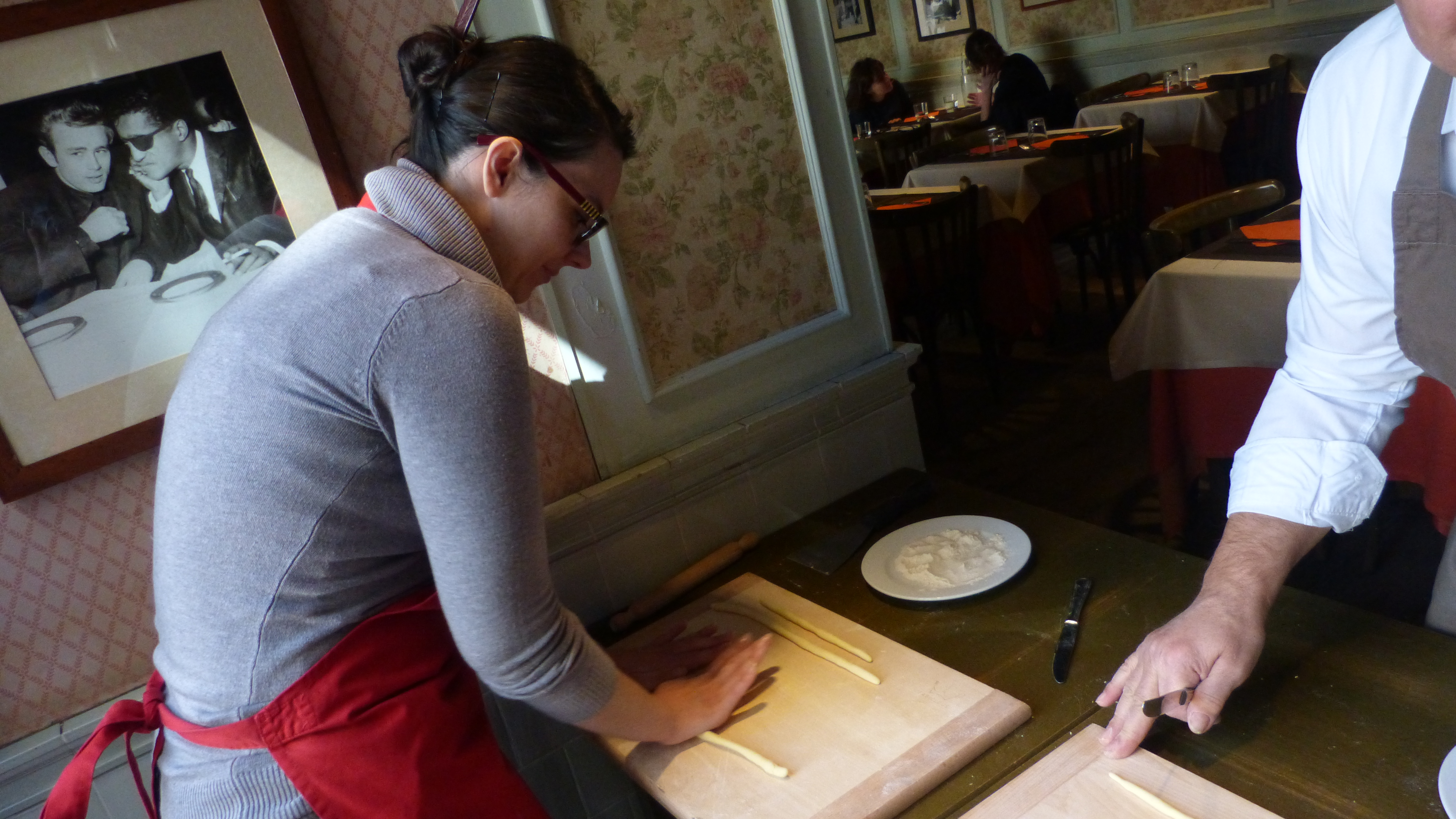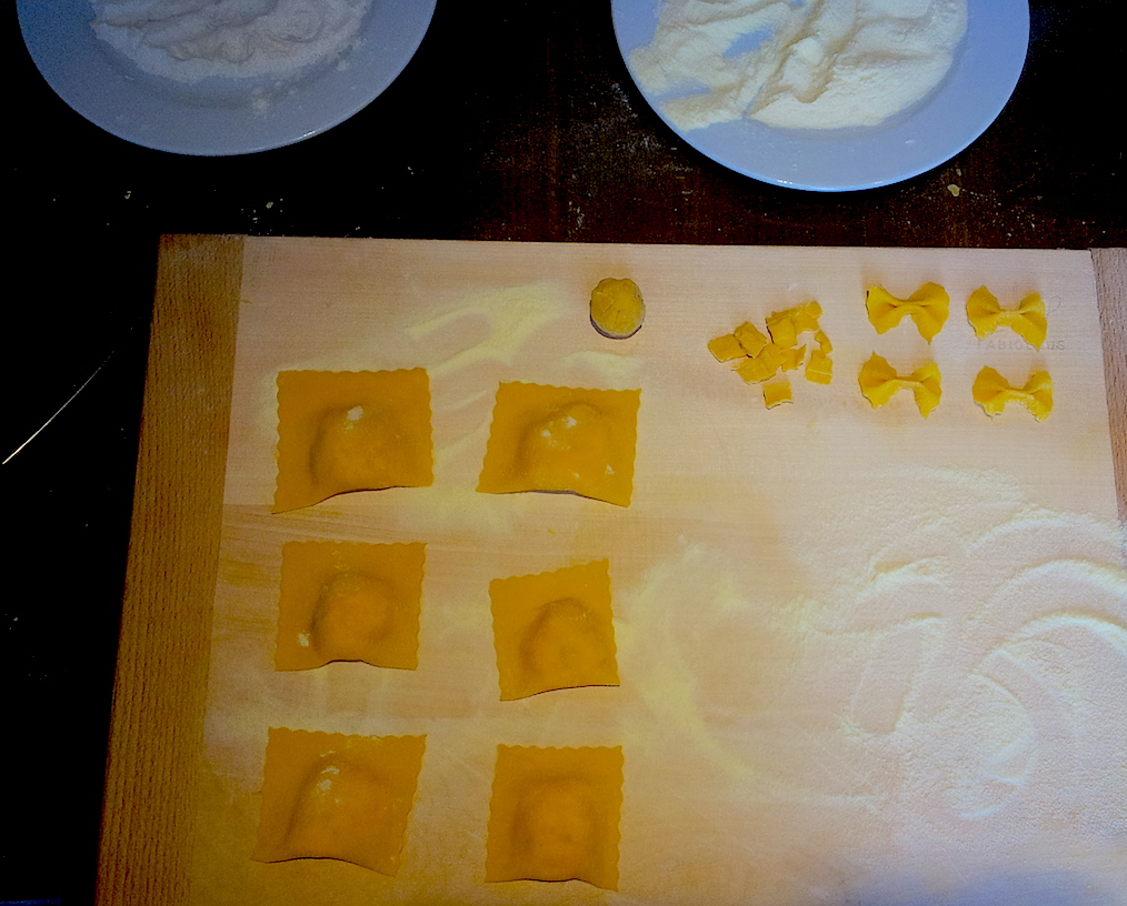 Arrivati, veniamo accolti da molti volti noti che ci sorridono dalle pareti. Cinema e Cucina? Le mie due più grandi passioni. Le premesse quindi sono state subito positive. Ci laviamo le mani, indossiamo i rossi grembiuli e ci dirigiamo al tavolo di lavoro dove ci attendono tutti gli ingredienti per poter prepare i cavatelli alla puttanesca e la pasta all’uovo (ravioli e tagliatelle).