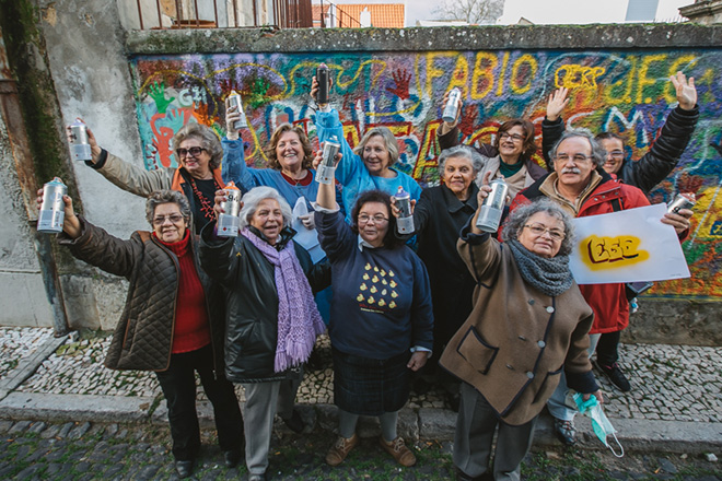 Cari nonne e nonni dite addio ad uncinetti, sferuzzamenti a maglia, scacchi e sudoku, oggi potete munirvi di bombolette e creare. Il progetto nasce durante il festival “Wool”- Festival de Arte Urbana da Covilhã. Il primo workshop fu organizzato nel 2013 (12-14 gennaio) a Carnide, e fu subito un sucesso. Già dopo appena 2 settimane (26-27 gennaio) hanno dato il via al secondo atto a Benfica. I nostri cari Senior hanno studiato l’arte urbana ed hanno contribuito ad abbellire alcuni quartieri della città alquanto grigi. Hanno creato gli stencil e sono scesi in strada per realizzare le proprie opere. Guardate un po’ il video.