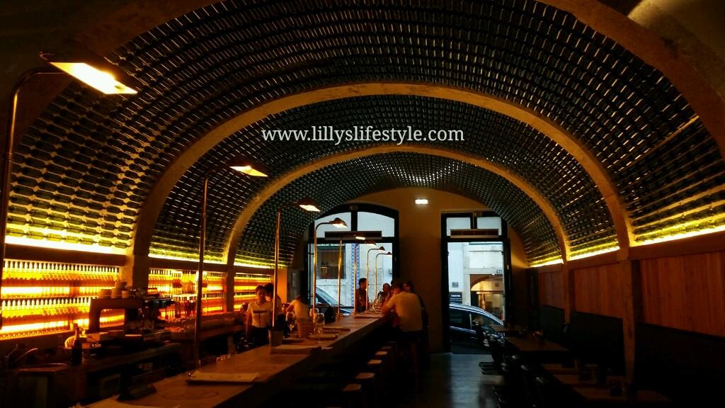 Il locale è raffinato ed informale allo stesso tempo, decorato con gusto. Impressionante la volta realizzata con le 3267 bottiglie di vino dal vetro verde, bottiglie utilizzate per il Periquita primo vino della marca dal 1850, una vera opera d’arte.