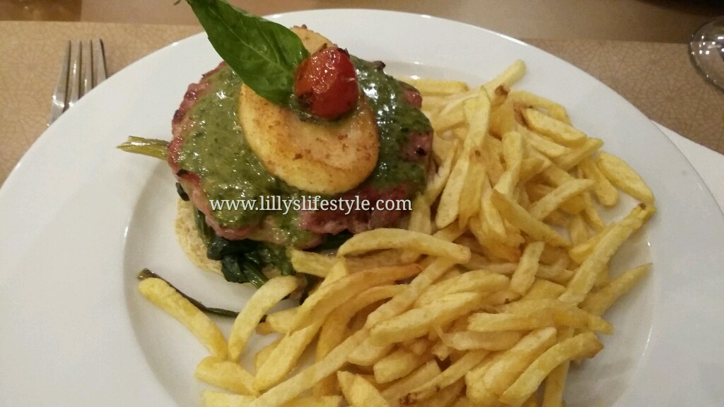 Il menù ha anche 3 opzioni per chi non mangia carne, come me, tra cui una vegetariana con un hamburger ai funghi. Noi optiamo per un Modena (hamburger di manzo con pomodori, formaggio e uovo all’occhio di bue) e un Sicilia (hamburger di tonno su letto di spinaci stufati, salsa pesto fatta in casa ed una fettina di mozzarella impanata e fritta), delizioso.