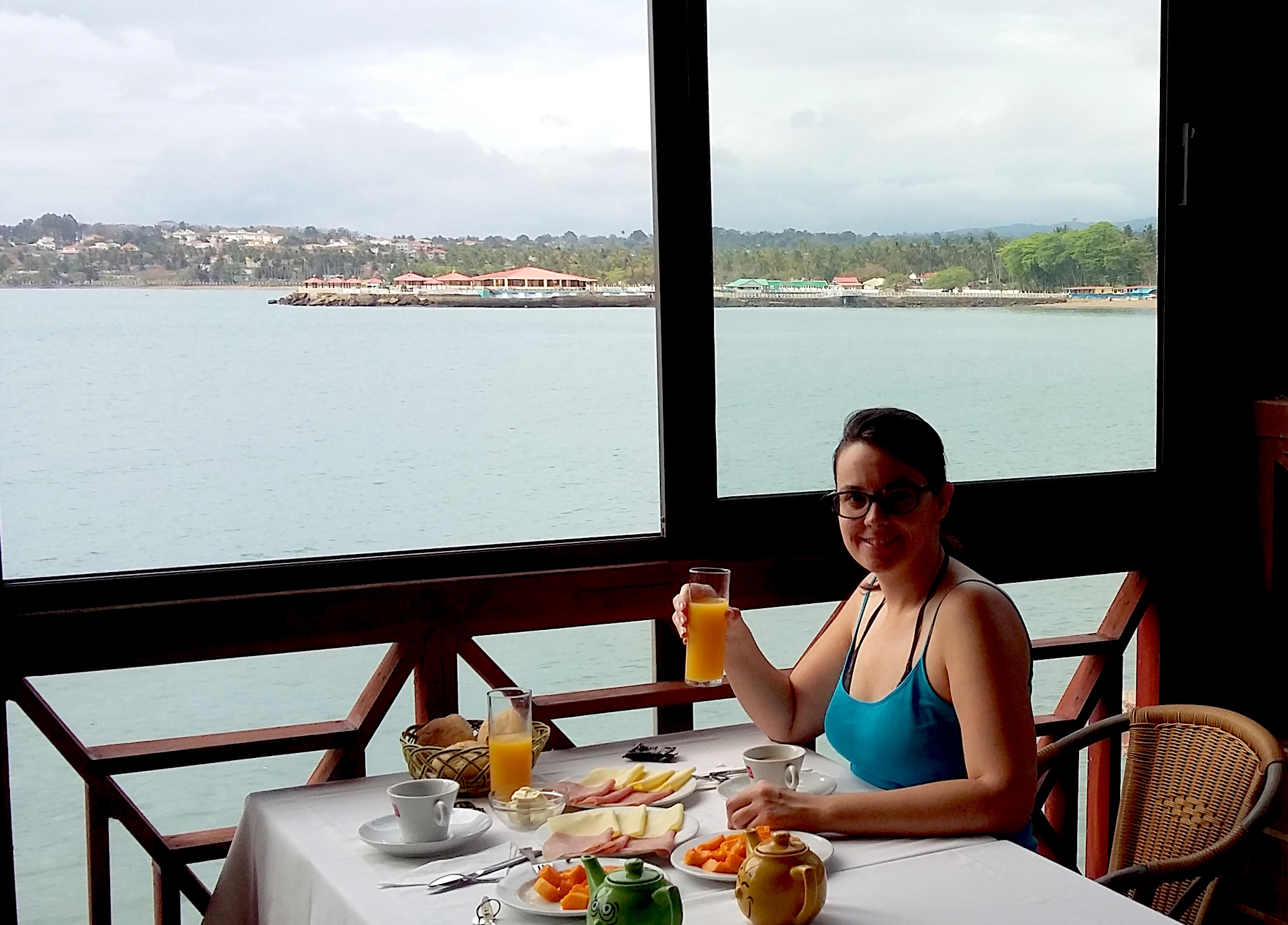 Le prime due notti a São Tomé (capitale) siamo stati ospiti dell’hotel O Bigodes, nome simpatico nato un po’ per gioco durante una conversazione tra il proprietario António e un amico. Visto che il proprietario ha i baffi, che in portoghese si dice bigodes, e non aveva ancora trovato un nome per il suo ristorante, alla fine la battutina l’ha fatta da padrone ed ecco trovato il nome giusto ed indimenticabile. Come localizzazione è ottima per chi atterra tardi in città, l’hotel infatti dista a meno di 10 min a piedi dall’aeroporto. La strada è sicura e potete raggiungere l’hotel a piedi, proprio come abbiamo fatto noi. Non temete non si sente nessun rumore se non quello del mare, visto che è uno degli unici hotel della capitale con le stanze non solo vista mare, anzi oceano, ma proprio sull’acqua.
