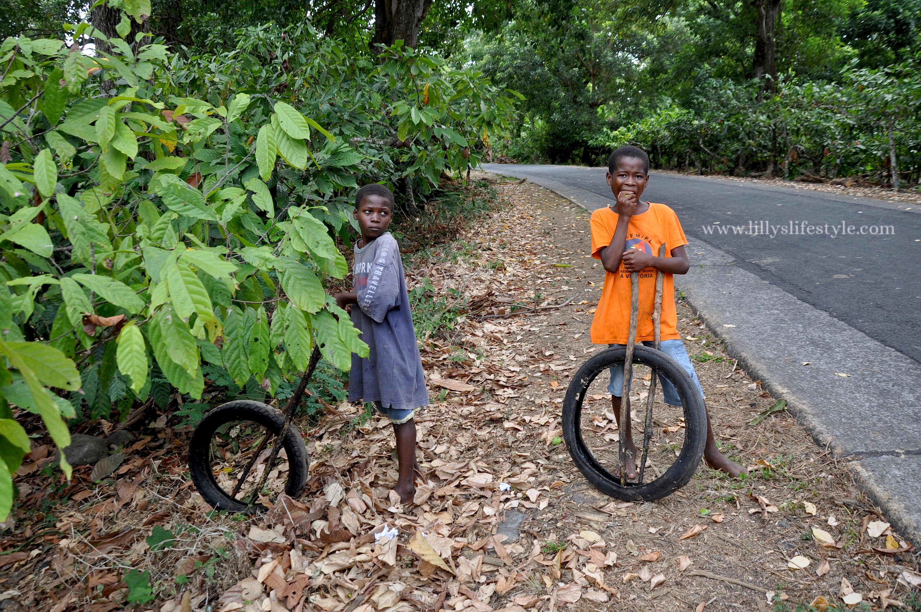 Proseguiamo il nostro viaggio on the road, incontriamo moltissimi bambini che giocano con i pneumatici delle motociclette o con altri oggetti di scarto trasformati in giocattoli. Ricordo di aver visto una bottiglia d’acqua con le ruote trasformata in camioncino. Molti i bambini seduti sull’asfalto, per questo guidate piano e con prudenza, li troverete ad osservarvi curiosi e a salutarvi sempre con un sorriso grande mentre mangiano in continuazione frutti freschi di cacao.