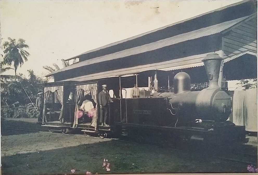 Salutati i membri della comunità restiamo nell’entroterra, abbandoniamo il mare per immergerci in strade costeggiate da banani e alberi di cocco. La seconda tappa doveva essere la Cascata Rio Douro, ma come vi avevo già accennato qui, non l’abbiamo voluta visitare per principio. Durante il percorso, per arrivare alla nostra terza tappa, passiamo per il villaggio di Guadalupe, pur non essendo stato menzionato nella descrizione del tour credo valga la pena evidenziarlo. Arriviamo così alla famosa Roça Agostino Neto, l’attraversiamo in macchina perché non volevamo perdere molto tempo a visitarla visto il nostro ricco programma. Una nota curiosa voglio però scriverla, in questa Roça si notano dei binari per strada, chiedendo alla nostra preziosissima guida scopriamo che in queste Roças maggiori si utilizzavano dei trenini sia per il trasporto del cacao e sia per il trasporto del padrone della tenuta. Abbiamo trovato una foto anche nel centro d’arte Cacau nella capitale.