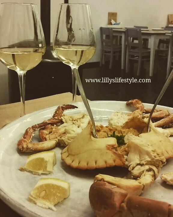 In attesa che si preparasse il granchio gigante (granciporro credo si chiami in italiano) scelto da noi nella vasca, chiediamo come antipasto un piatto di vongole (Amêijoas à Bulhão Pato) finalmente senza il mio odiato coriandolo. Deliziose. Per rinfrescare il palato sorseggiamo un vino verde Muros Antigos, Loureiro 2014. Concluso l’antipasto, arriva il nostro granchio magistralmente preparato. Inoltre, per la prima volta, abbiamo mangiato il granchio addormentato con l’aceto, una tecnica per me finora sconosciuta. Consiglierei giusto un’attenzione in più nella composizione del piatto che può esser migliorata.