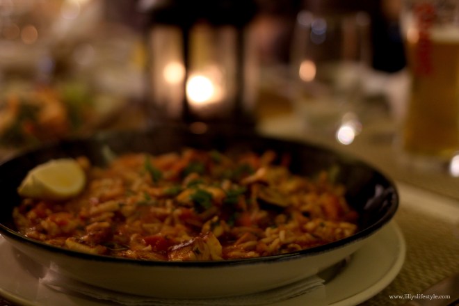 Ci accomodiamo e siamo subito coccolati con l’antipasto di base: le deliziose olive nere marinate e il burro fatto in casa dallo chef. Accompagniamo il tutto da un vino alentejano mentre il vero antipasto sta per arrivare, un piatto di mare e monti: bruschetta di gamberi con formaggio di capra e miele. Mi son fatta consigliare da Jorge, il proprietario del locale, avevo voglia di provare sapori nuovi.