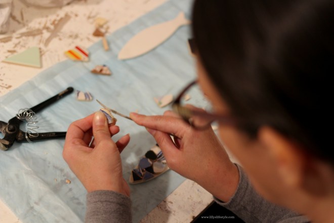 Entrati nel suo atelier ci spiega subito la tecnica del mosaico, ci invita a sfogliare un libro dedicato a quest’arte millenaria per prender ispirazione e ci mostra subito i colorati frammenti di mattonelle (azulejo) che possiamo utilizzare a piacimento per decorare la nostra sardina.