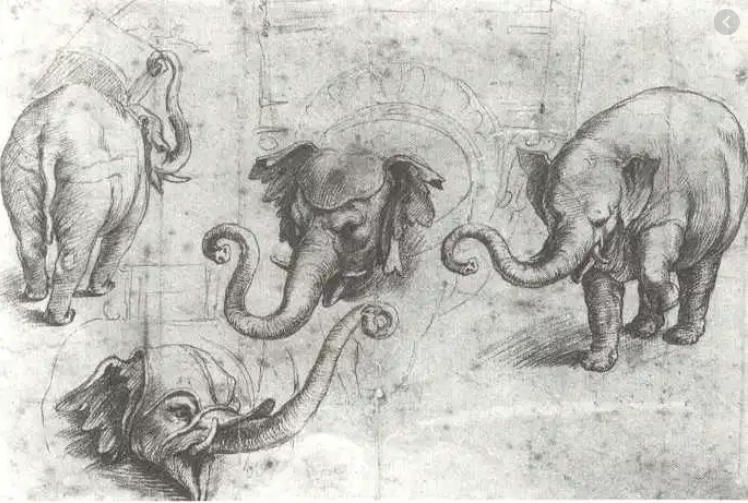 Il Papa chiese a Raffaello Sanzio di eseguire un dipinto, purtroppo andato perduto, ma restano gli schizzi che l’artista aveva realizzato in precedenza quando andava ad ammirare il grazioso pachiderma.