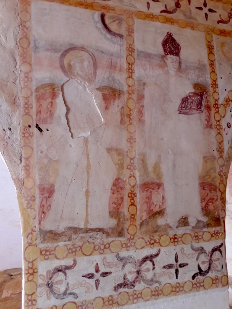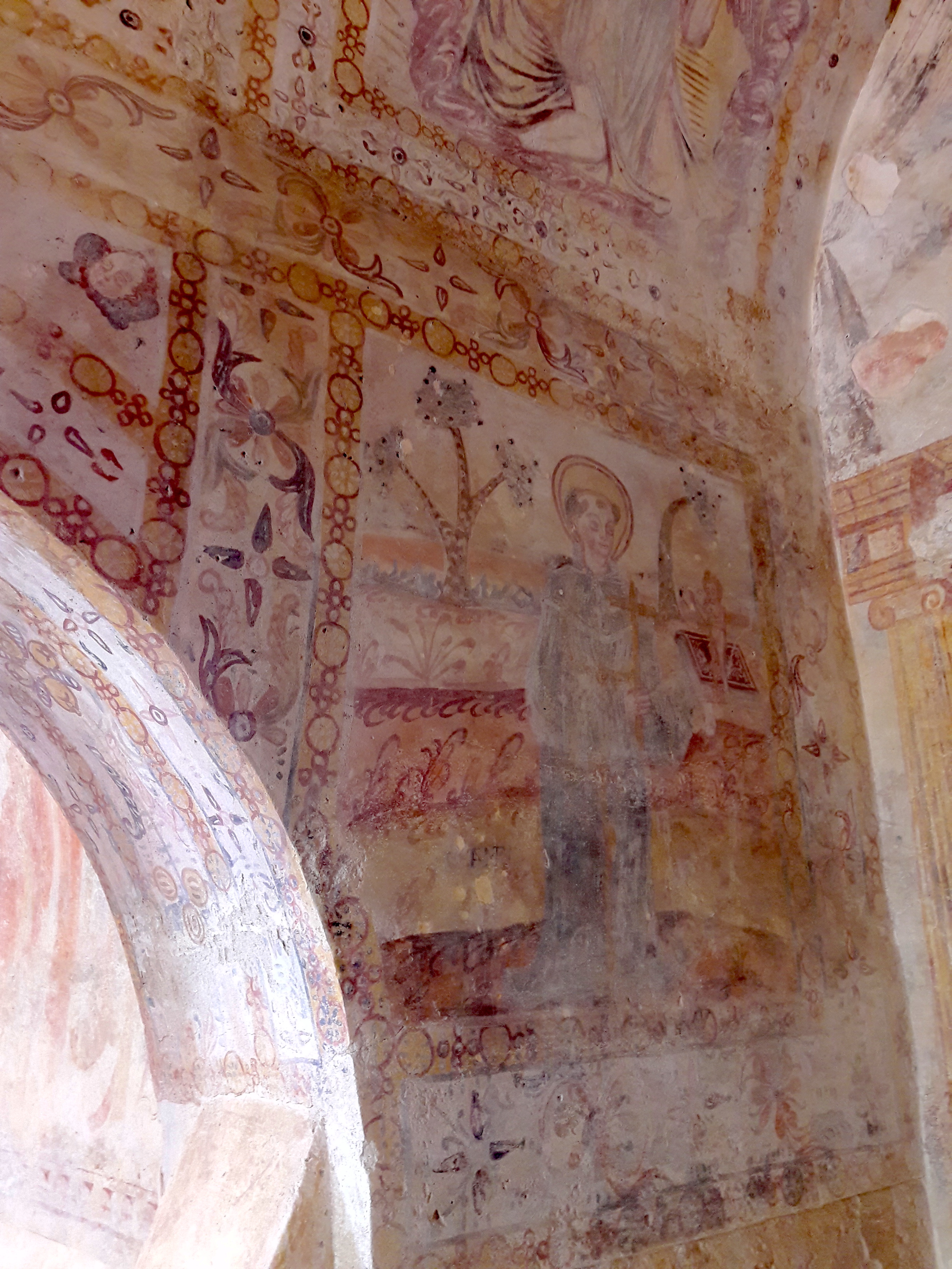 Come vi anticipavo, già in rovina, questo antico complesso romano fu occupato da due monasteri cristiani dedicati a São Cucufate, fondati in epoche diverse. Ognuno dei quali possedeva la propria chiesa, costruita in luoghi diversi della vecchia casa romana. Della prima chiesa sono visibili solo pochi ruderi ma la seconda è rimasta in un discreto stato di conservazione e noi siamo rimasti a bocca aperta per lo stato degli affreschi datati tra il XIV e il XVIII secolo e firmati dall’artista José de Escovar, artista molto conosciuto nella zona.