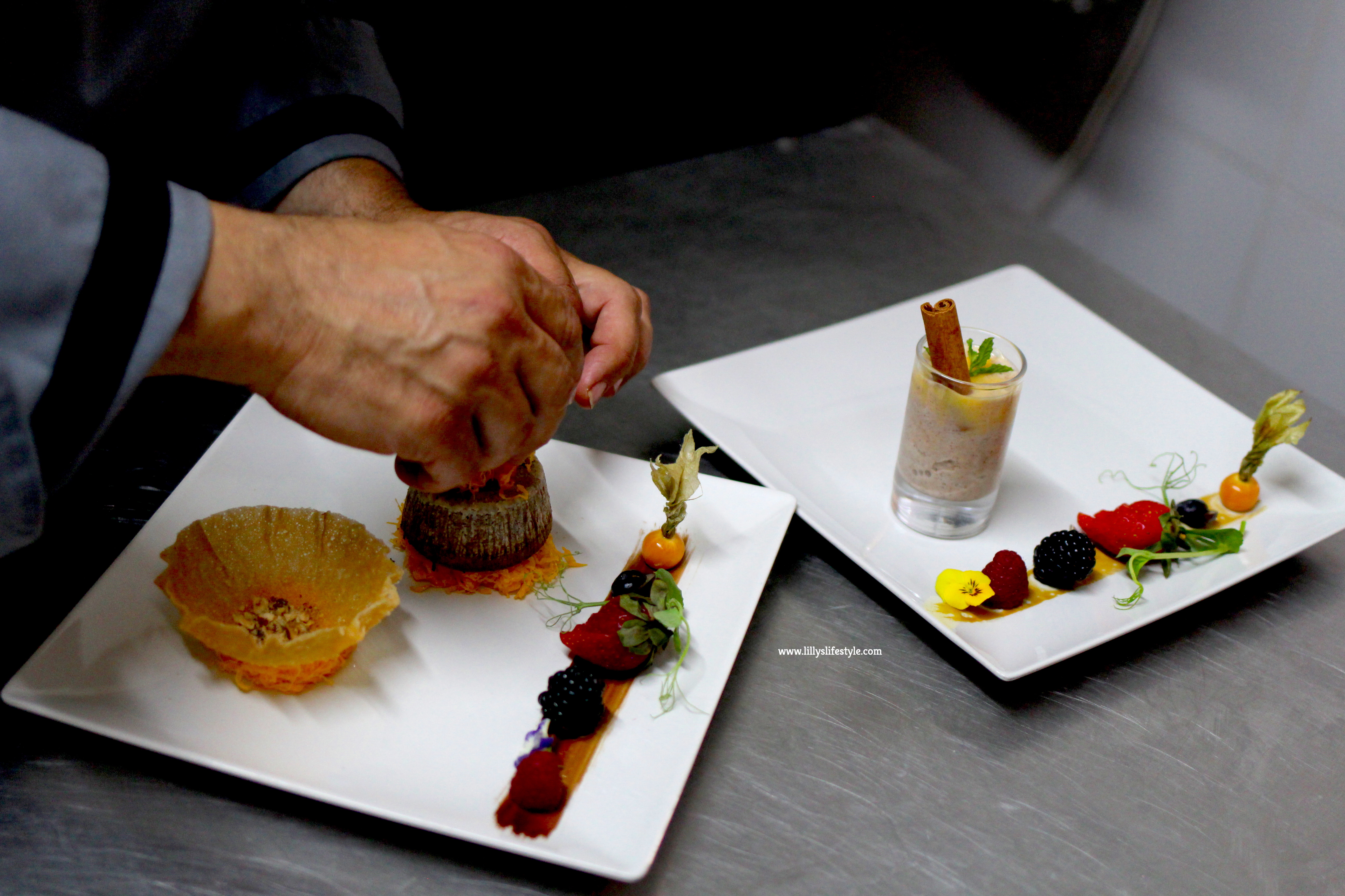 Arriva il “dolce” momento e lo chef ci prepara una trittico a dir poco paradisiaco per le nostre pupille gustative e non solo. La presentazione quasi ci blocca l’assaggio per non deturpare l’armonia di colori, le forme e la composizione.