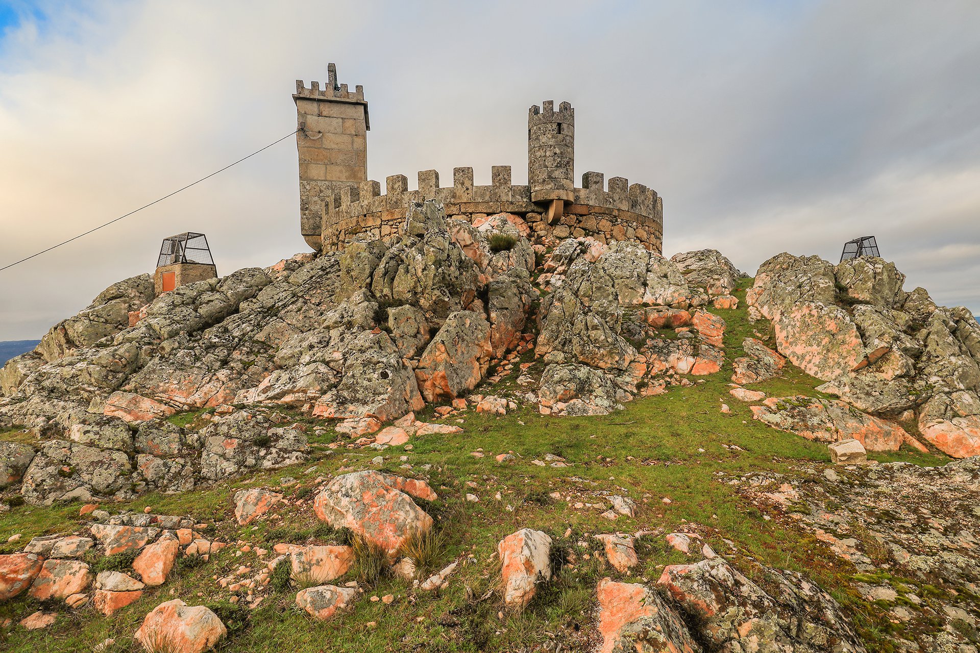 Il castello di Sabugal, chiamato anche “Castelo das Cinco Quinas” per la forma insolita del suo mastio, si trova in posizione dominante su un piccolo altopiano della catena montuosa della Malcata che controlla l’attraversamento del fiume Côa sulla sua sponda destra, da qui la sua importanza nell’antichità e nel Medioevo.